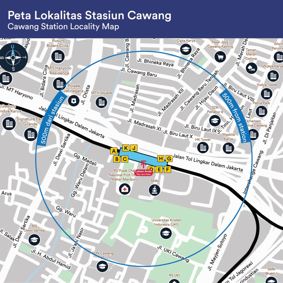 Stasiun LRT Cawang menawarkan kemudahan akses dengan menyediakan dua area pintu masuk dari sisi timur dan barat yang dapat dipilih oleh penumpang. Dengan dua opsi ini, penumpang dapat memilih jalur masuk yang paling sesuai dengan tujuan atau kenyamanan mereka.